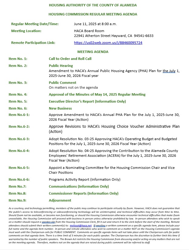 SCAM ALERT: HACA has been made aware of several scams via email and printed flyers indicating that HACA’s waitlist is open or will be opening soon. HACA’s waitlist is currently closed. HACA will advertise waitlist openings at www.haca.net and at (510) 538-8876 extension 1. DO NOT PAY MONEY TO APPLY FOR OR RECEIVE A SECTION 8 HOUSING CHOICE VOUCHER.